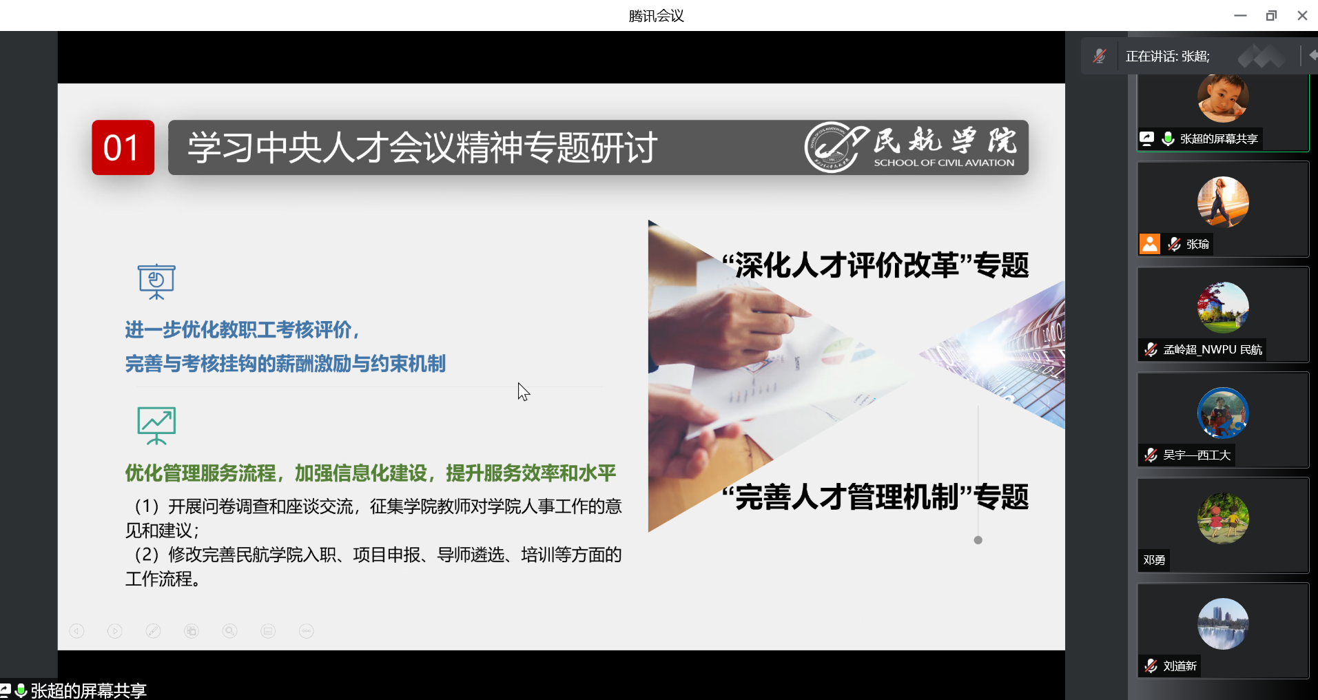 随后,会议分别围绕如何加强一流科技领军人才和创新团队建设,如何加强青年人才队伍建设,如何加强青年后备人才分类选拔和培养,持续完善准长聘制度、加强人才队伍建设,持续加强博士后和专职科研队伍建设,探索建立团队考核评价激励机制,完善与考核挂钩的薪酬激励与约束机制、优化管理服务流程等八个方面开展专题研讨,与会人员就如何继续做好公司人才工作提出了意见和建议。