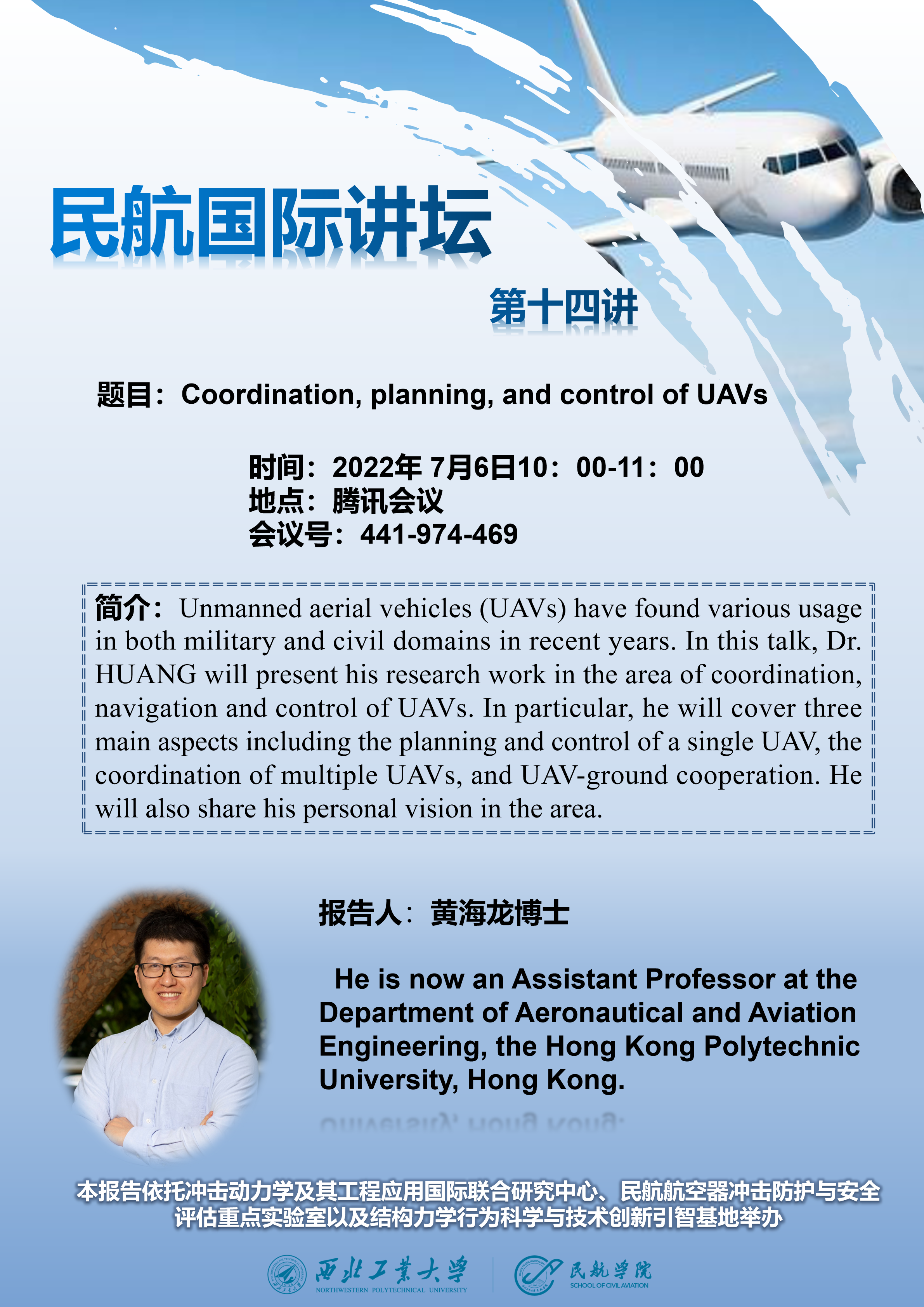 7月6日上午十点,公司拟线上举办“Coordination, planning, and control of UAVs”专题讲座,届时欢迎各位老师同学参会交流。报告信息如下: